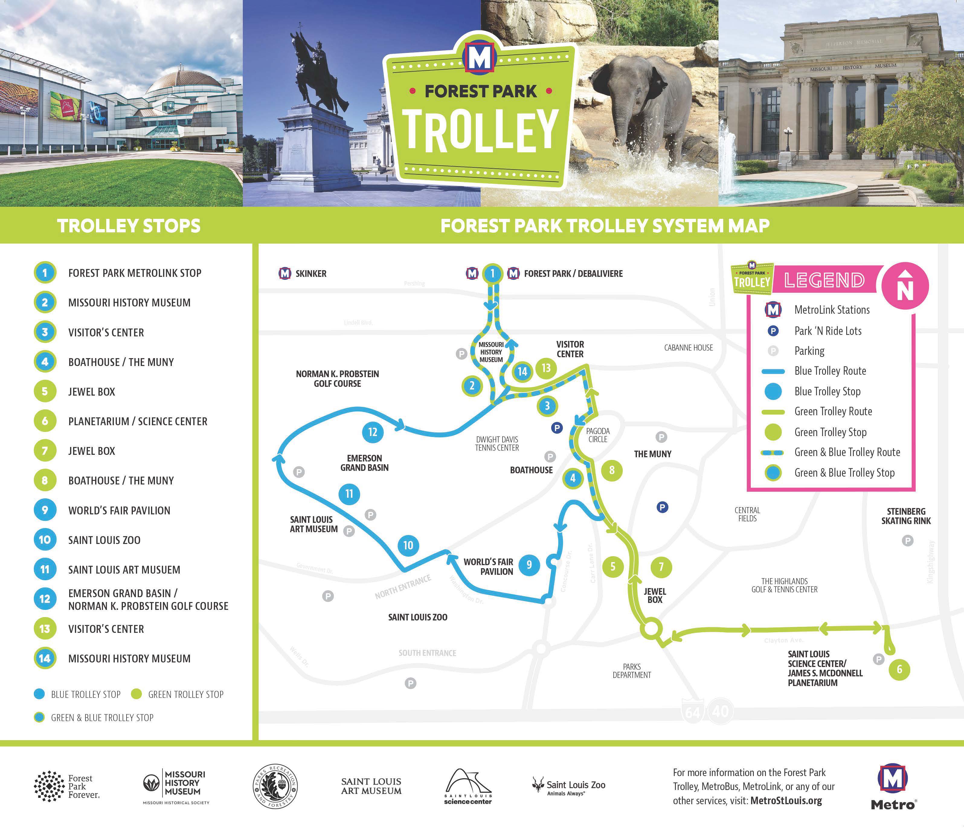 The Forest Park Trolley service is a partnership between Forest Park Forever, Metro, Missouri History Museum, Saint Louis Art Museum, Saint Louis Science Center, Saint Louis Zoo and the City of St. Louis Department of Parks, Recreation and Forestry.